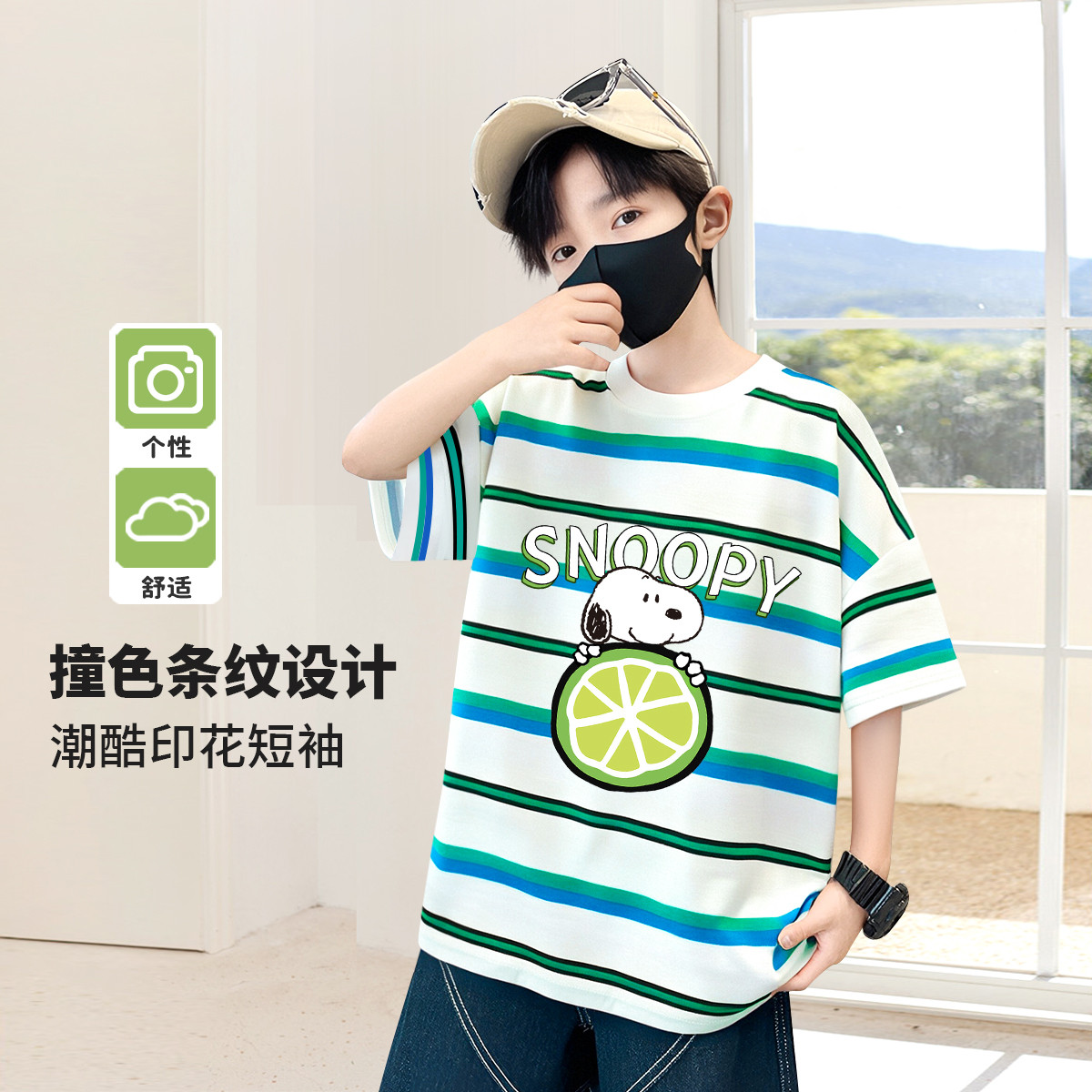 儿童短袖夏季男童洋气卡通蓝绿条纹T恤舒适百搭亲肤中大童装 422111