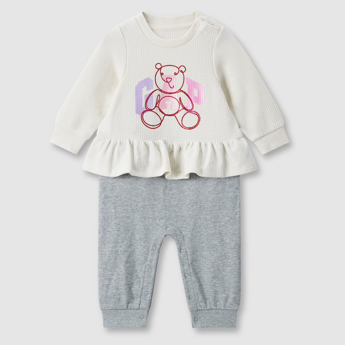 Gap婴儿2024秋季款小熊荷叶边华夫格连体衣儿童装包屁衣644632 733914