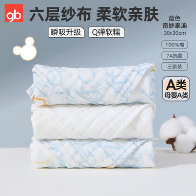 好孩子 7A抗菌纯棉六层纱布巾 三条装 (W) 奇妙泰迪 蓝色
