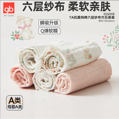 好孩子 7A抗菌纯棉六层纱布巾 五条装(W) 花园城堡 粉色