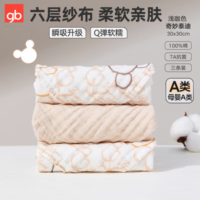 好孩子 7A抗菌纯棉六层纱布巾 三条装 (W) 奇妙泰迪 浅咖色