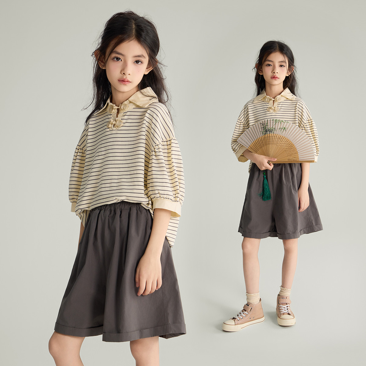 女童套装2024夏季儿童中大童翻领新中式短袖上衣短裤两件套 027407