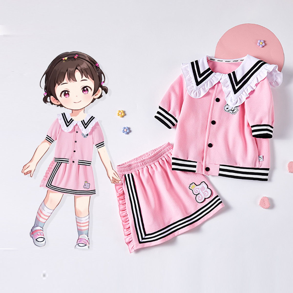 【女童套装】25年夏季新款翻领T恤小中大童半身裙A字裙两件套 526559