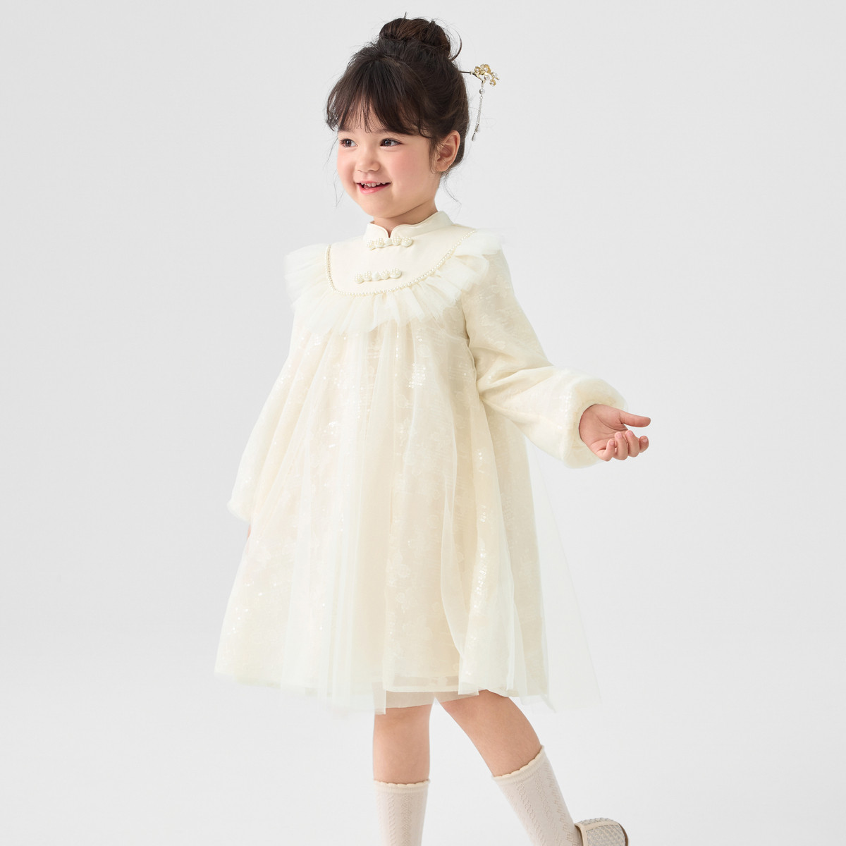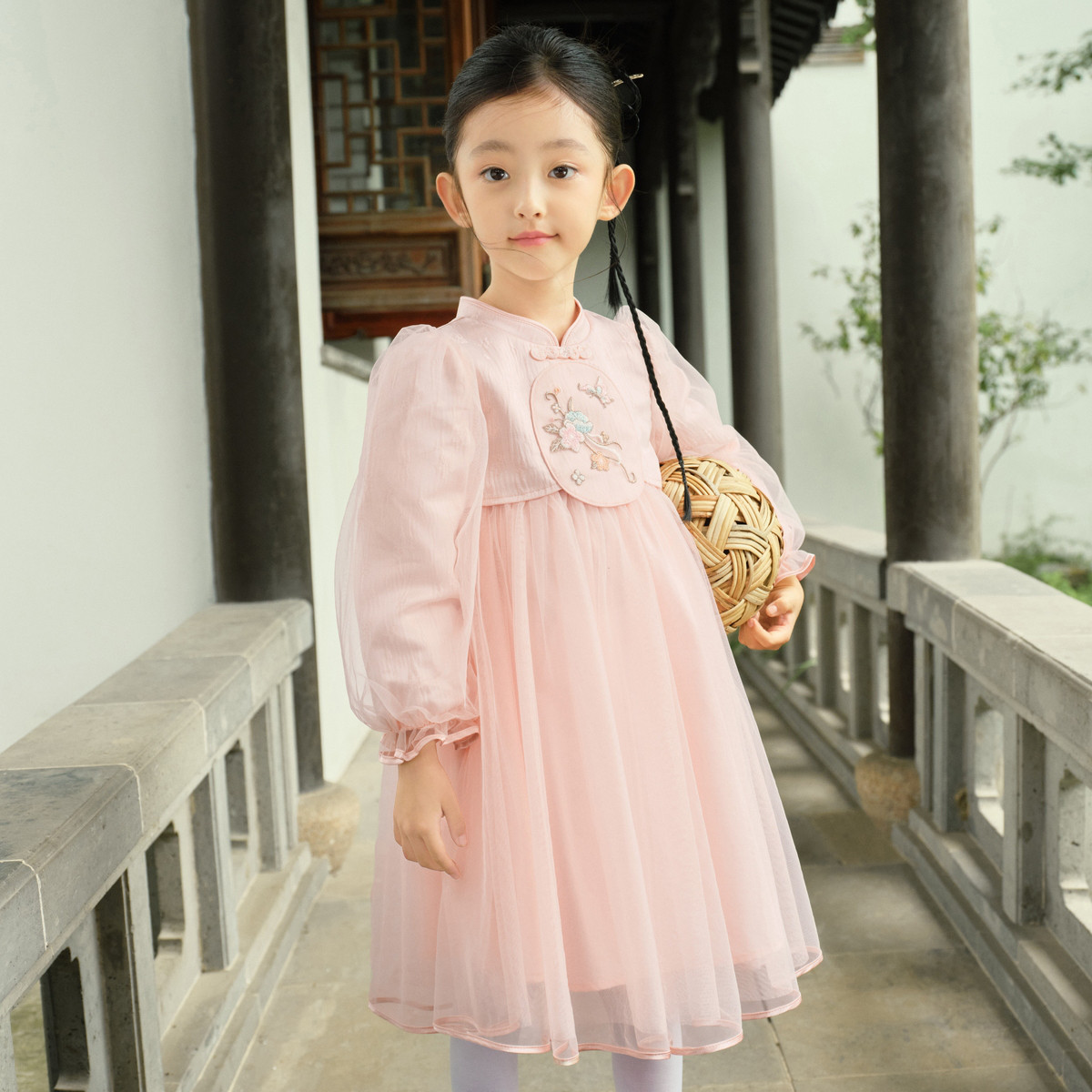 新中式国风连衣裙汉服女童裙子儿童小童立领甜美盘扣宝宝网纱春秋 163205