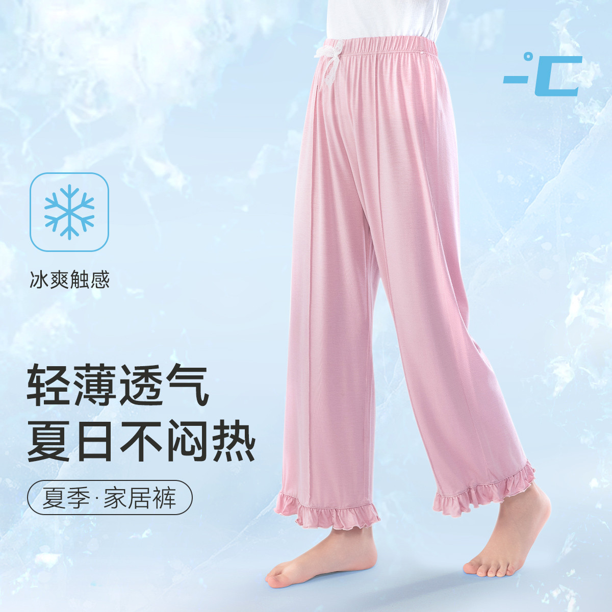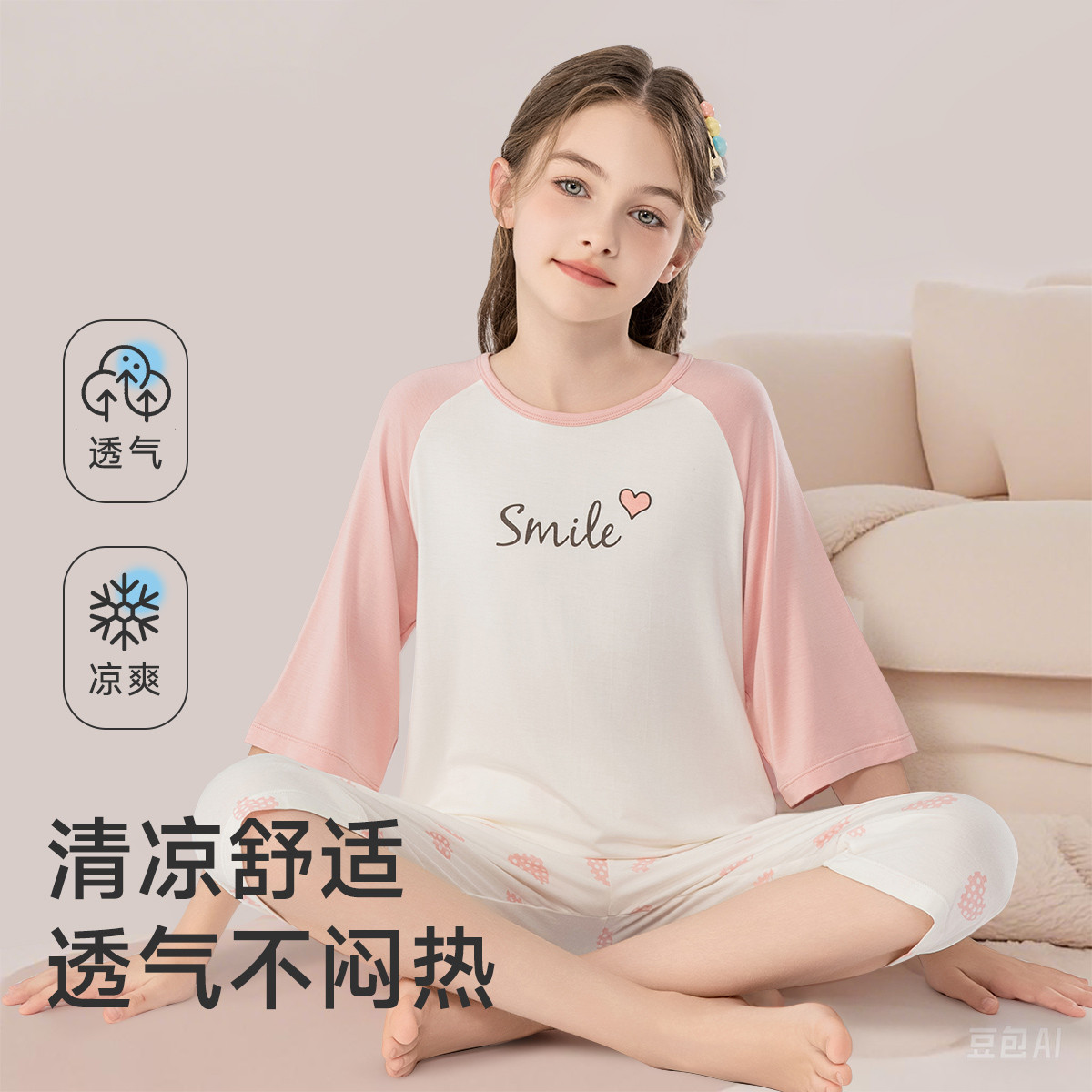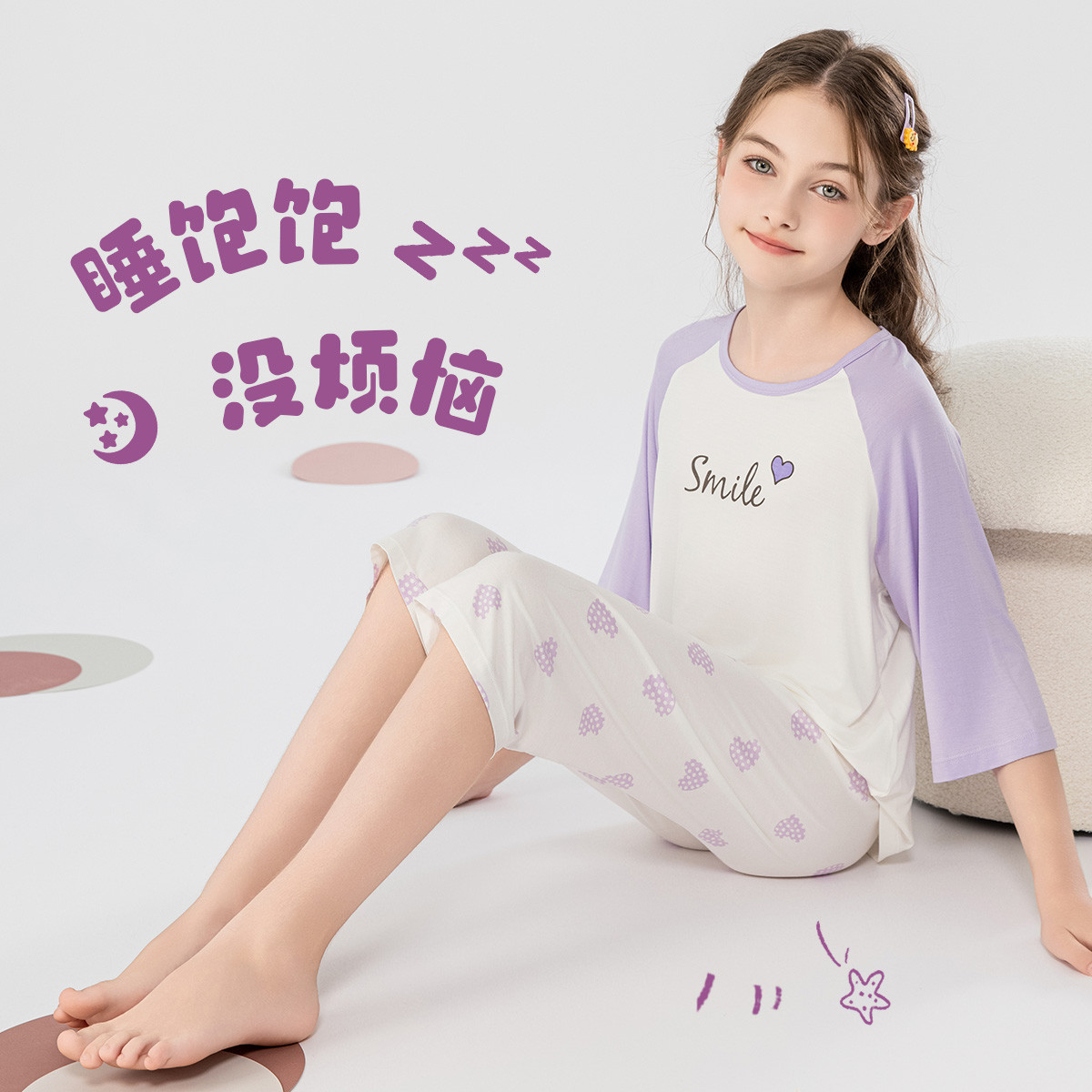 儿童睡衣睡裤夏季薄款冰丝高弹圆领女童家居服套装中大童空调服 086475