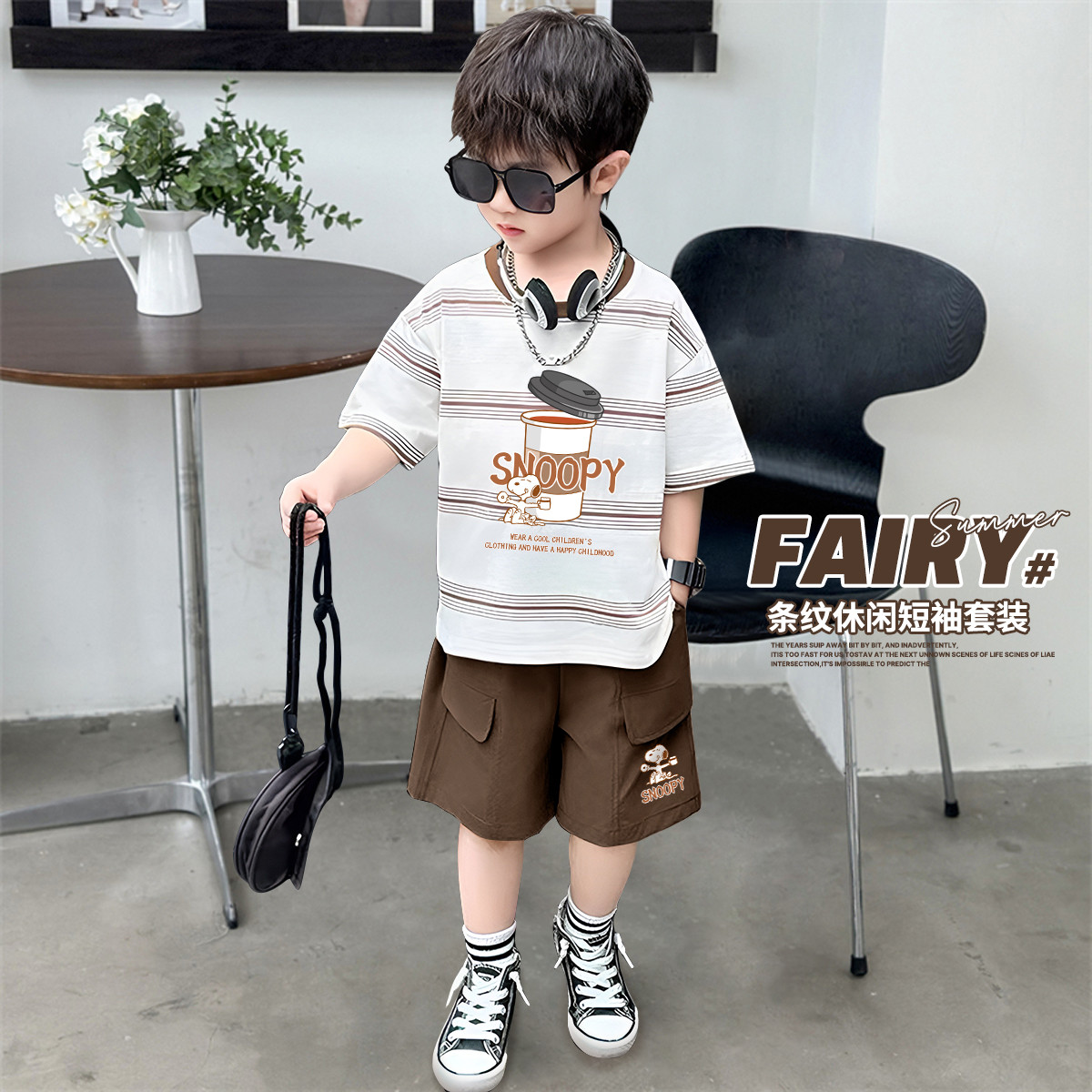 儿童装男童夏季套装2025新款中大童条纹潮流短袖休闲两件套 077471