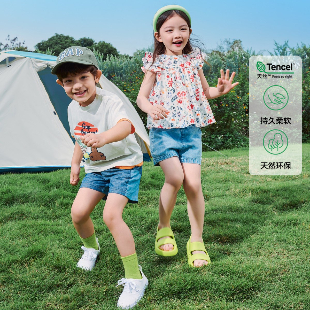 Gap女幼童2024夏季兰精天丝满印花上衣小飞袖短袖衬衫466639 479642