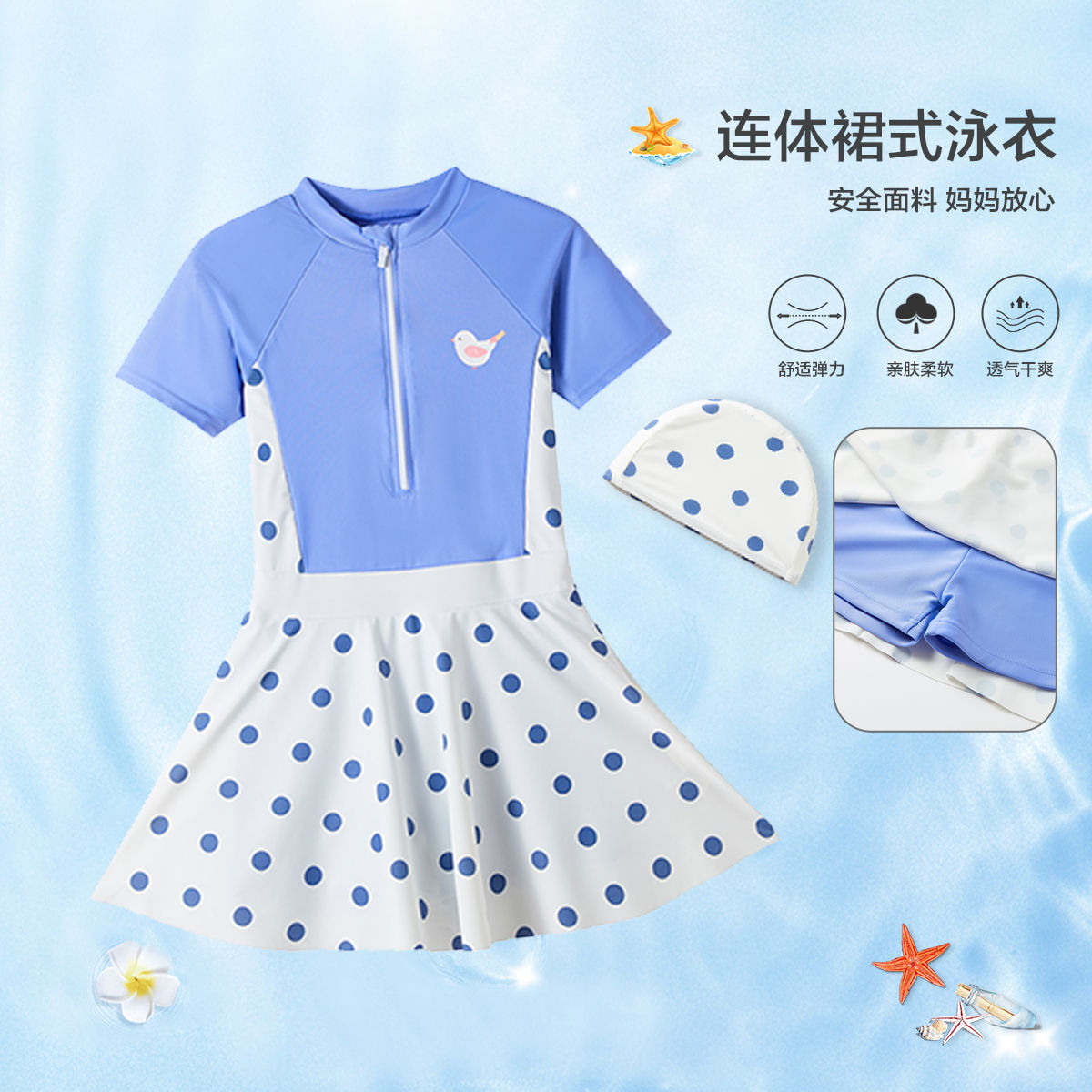 【含泳帽】女童泳衣2024夏儿童卡通长袖波点泳衣连体式泳衣潮 156367