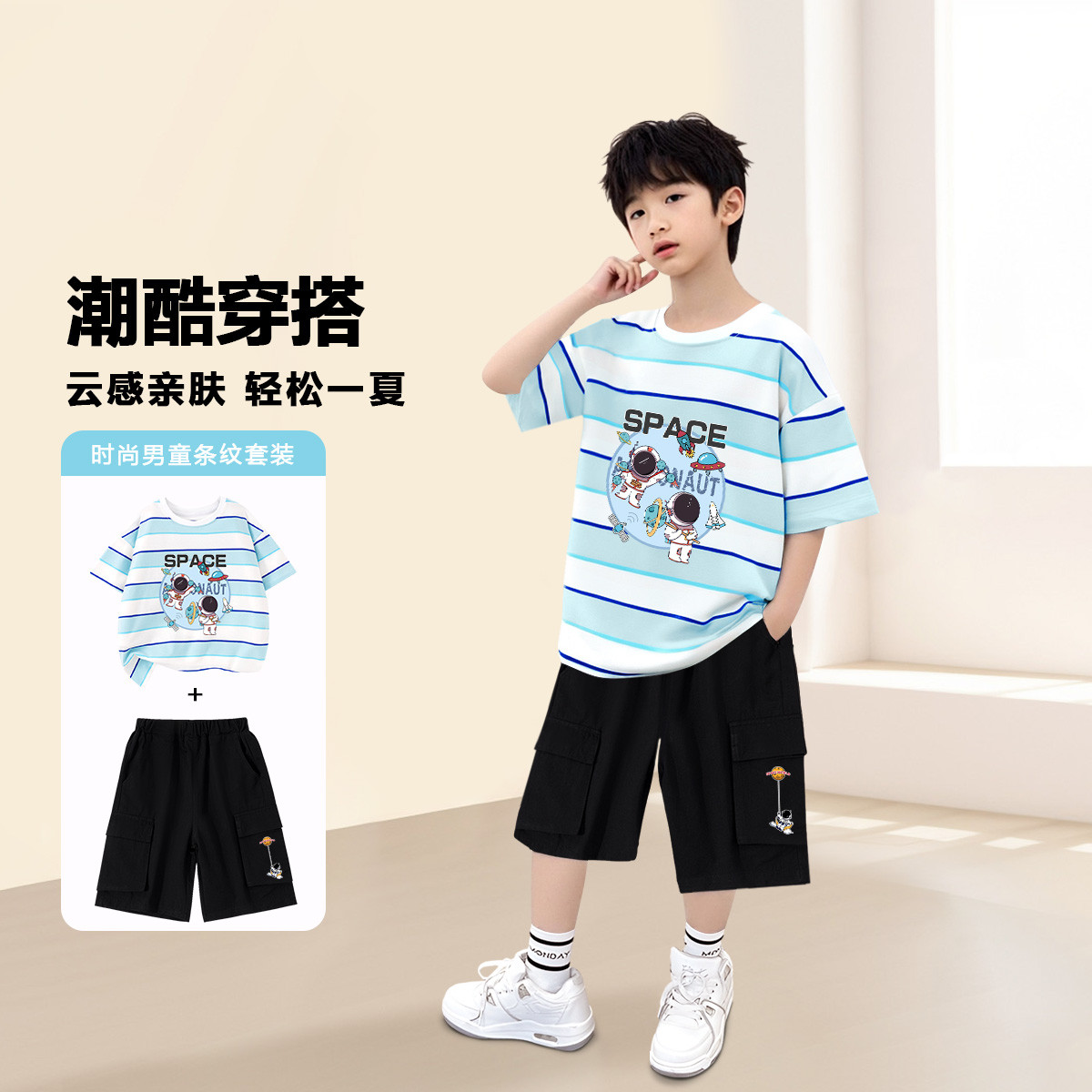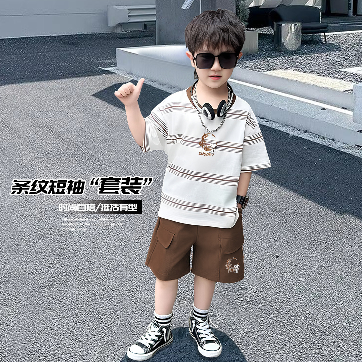 男童夏季套装2025新款中大童男孩条纹潮酷短袖T休闲两件套 188063