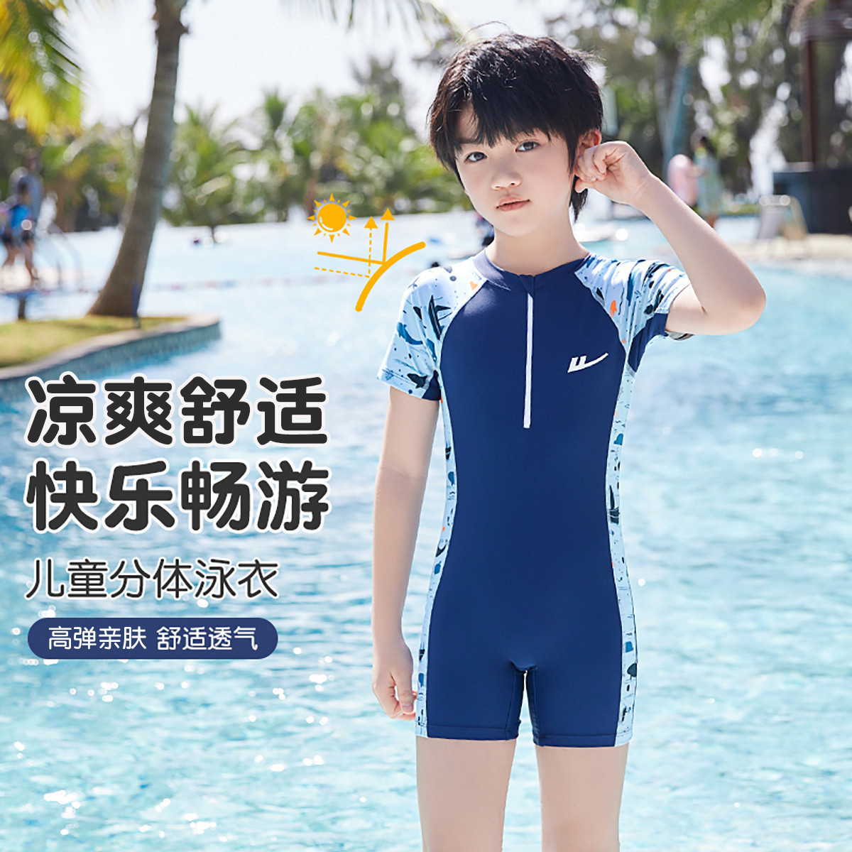 儿童泳衣男童连体夏季中大童泳装男孩专业训练温泉游泳衣泳帽套装 492179