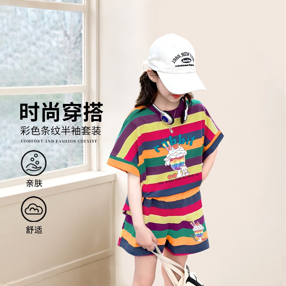 夏季女童套装百搭2025运动套装儿童舒适透气拼接短裤中大童装 216735