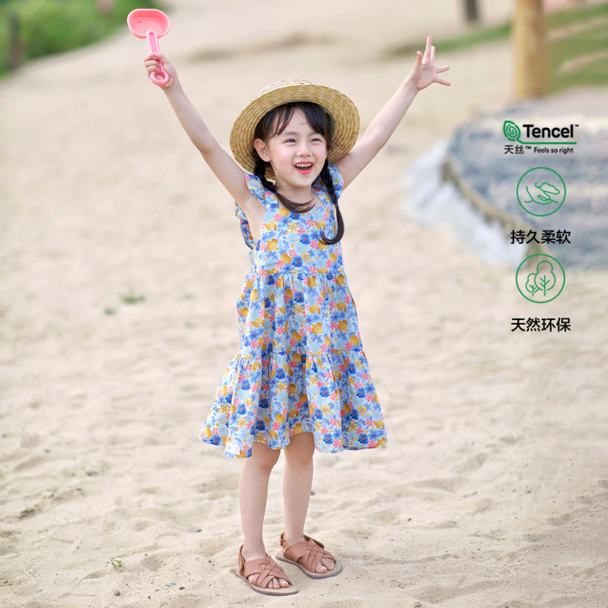Gap女幼童2024春秋季款兰精天丝满印花小飞袖连衣裙儿童装466792 348122