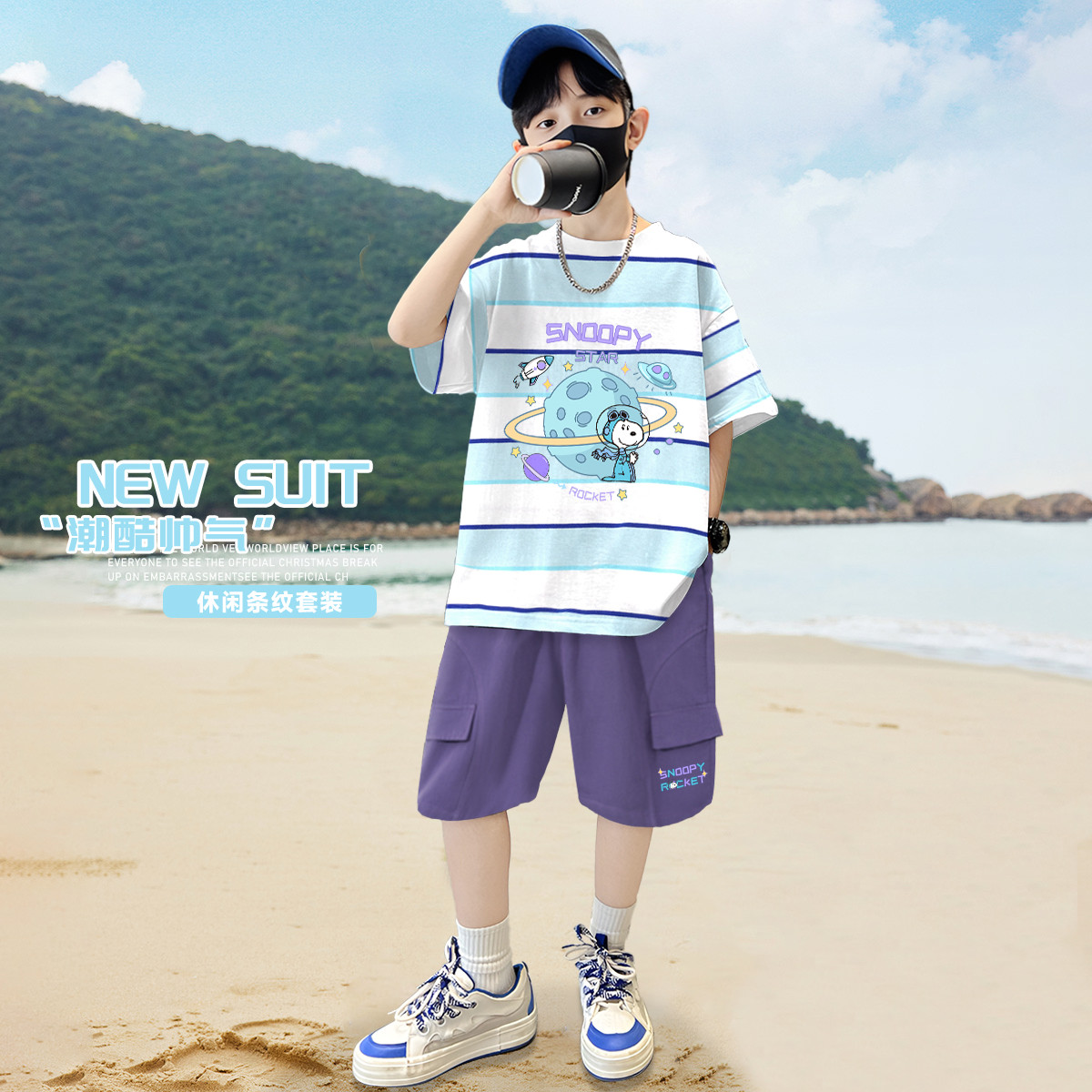 夏季儿童套装2025洋气潮流男童条纹短袖舒适透气工装裤中大童 072607