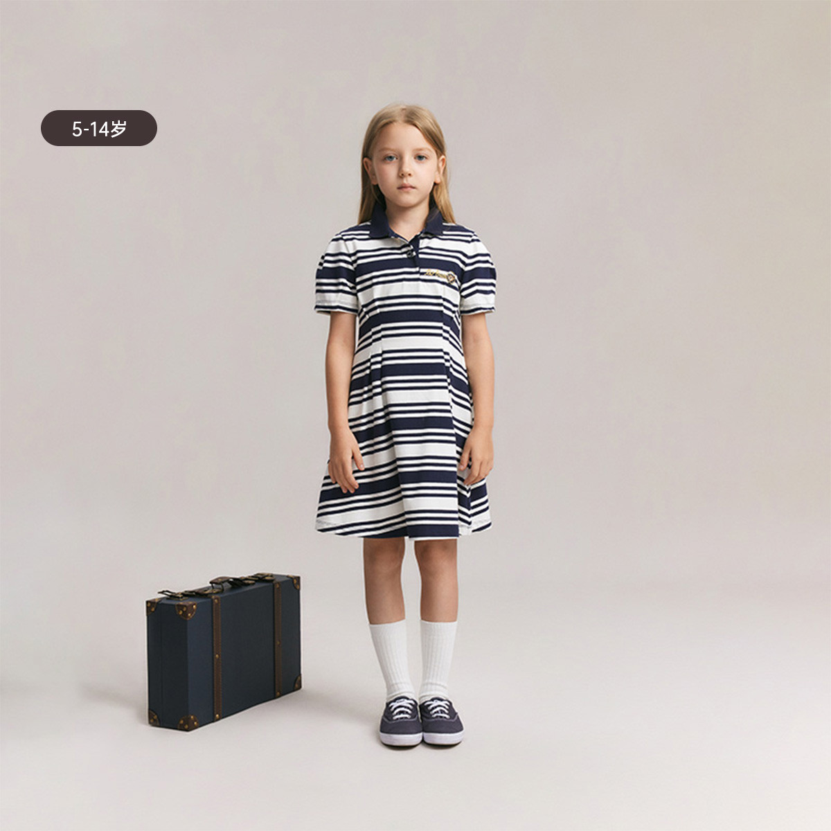 小熊童装夏季女童休闲条纹翻领收腰连衣裙 727425