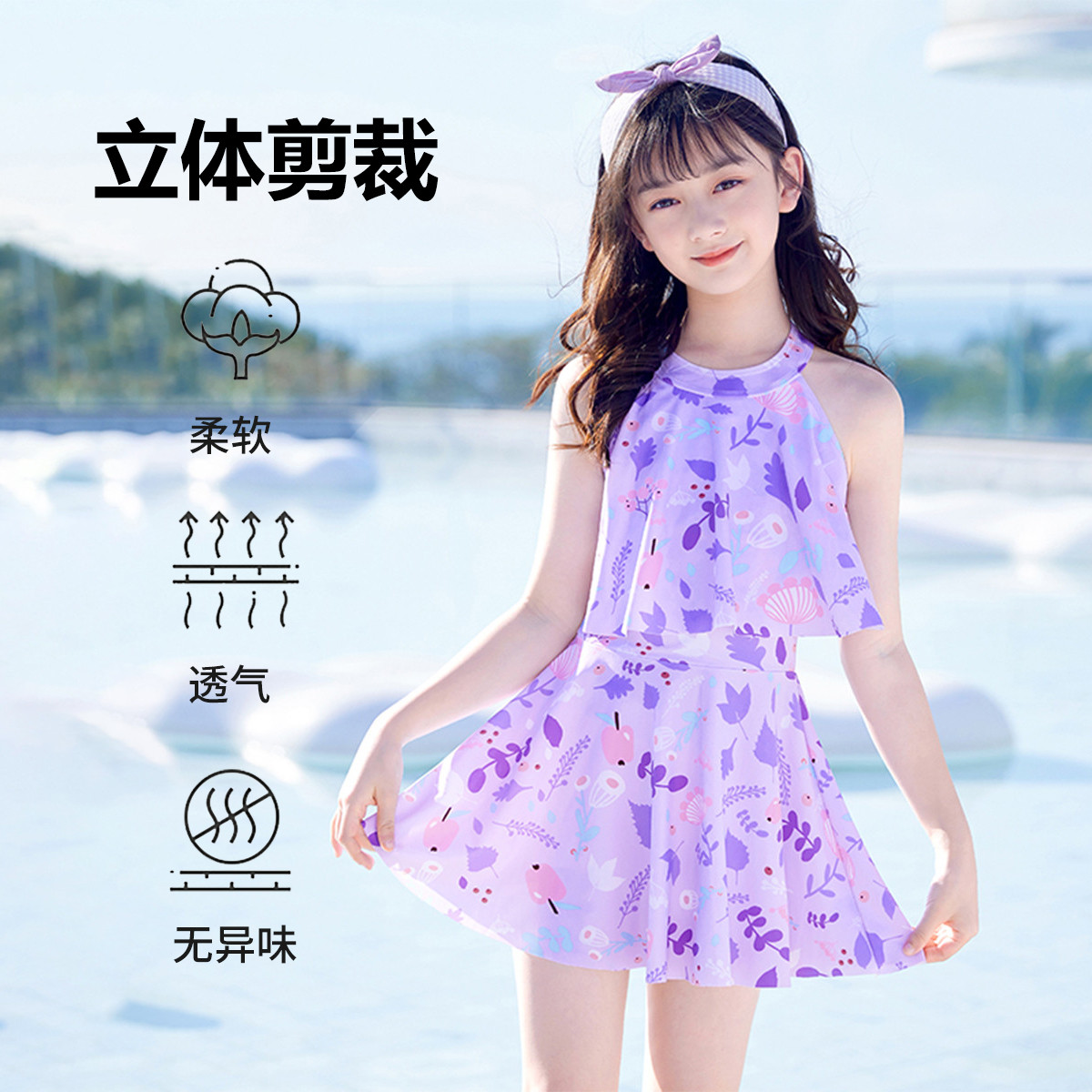儿童泳衣女童连体裙式泳衣中大童专业训练海边度假游泳池玩水泳衣 651091