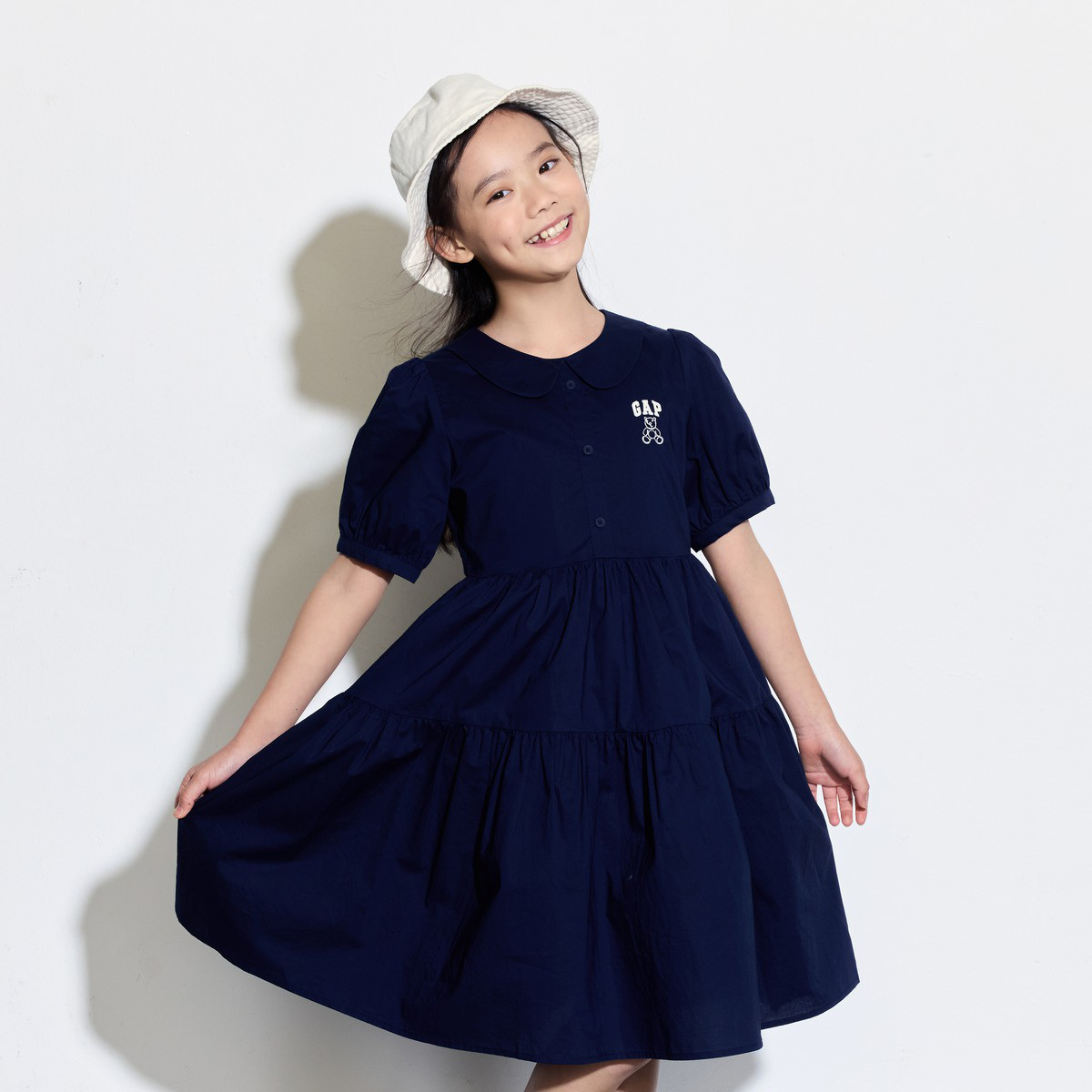 Gap女童2024春秋季翻领泡泡袖抓褶双层连衣裙儿童装洋装514871 031898