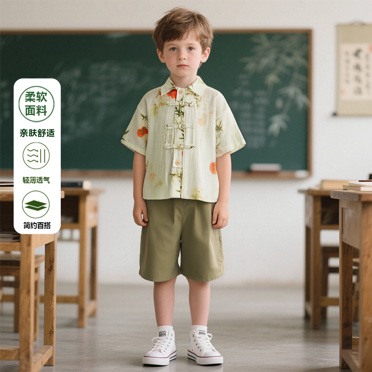 【男孩衬衫短袖套装】男童新中式水墨舒适透气儿童纯棉夏季两件套 898655