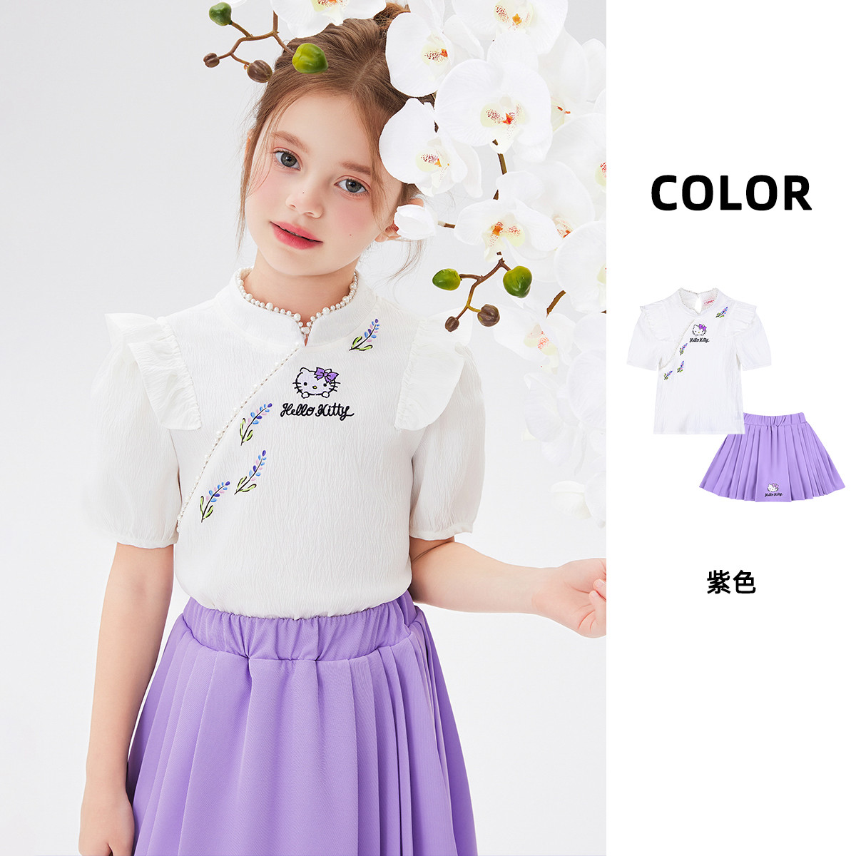 女童夏季套装2025款女宝中式钉珠立领小飞袖设计上衣压轴裙子 091230