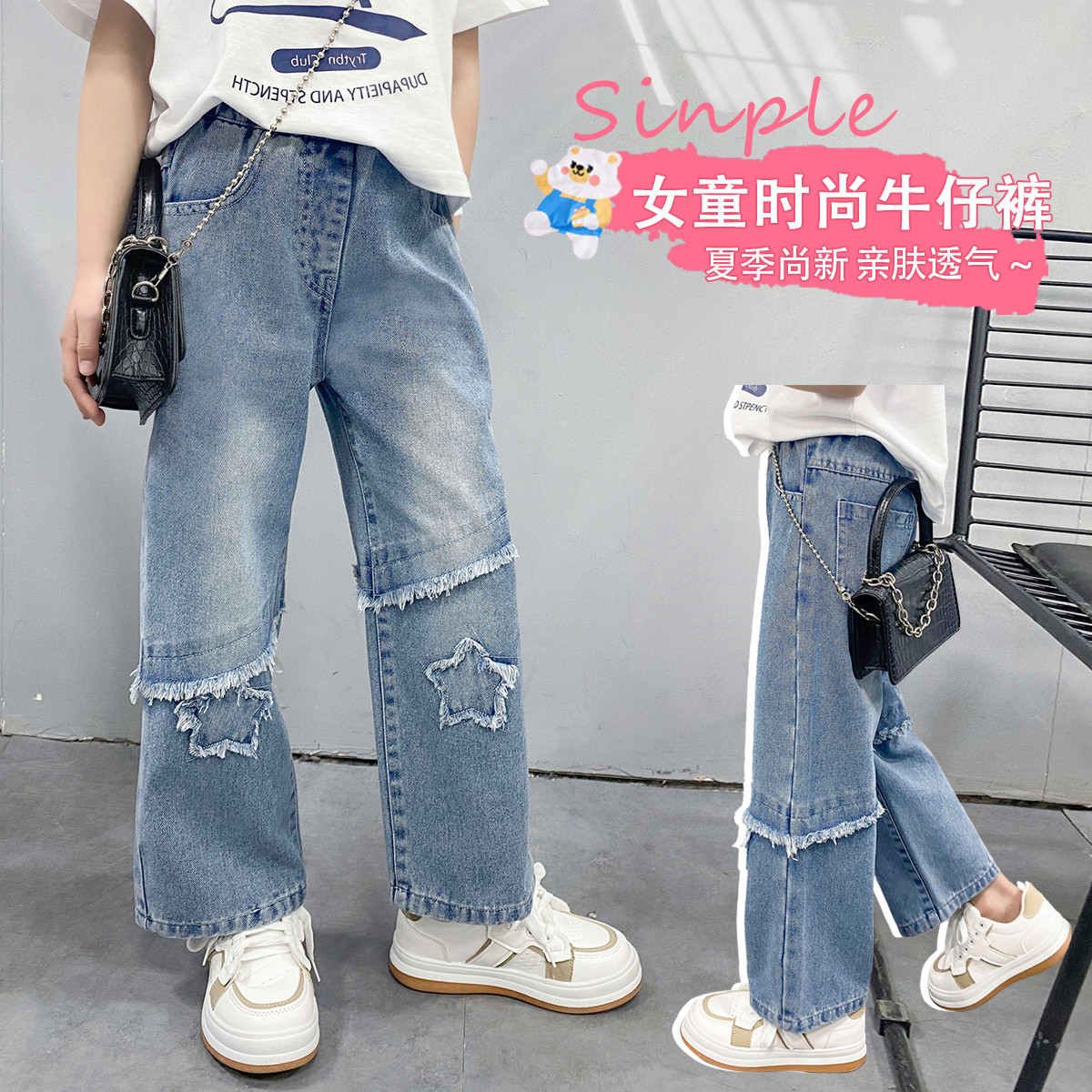 女童中大童裤子春季2025儿童松紧腰直筒牛仔裤休闲长裤 943183