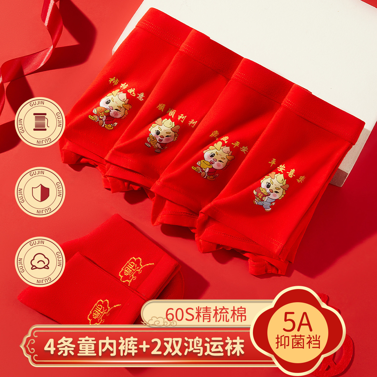 【5A抑菌四条装礼盒】棉质儿童内裤男童内裤平角中大童纯色红色 973643