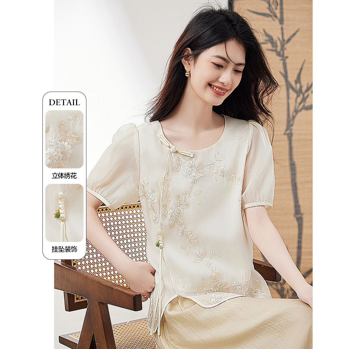 新中式衬衫女2024夏季新款国风绣花气质时尚盘扣轻薄显瘦上衣 993624