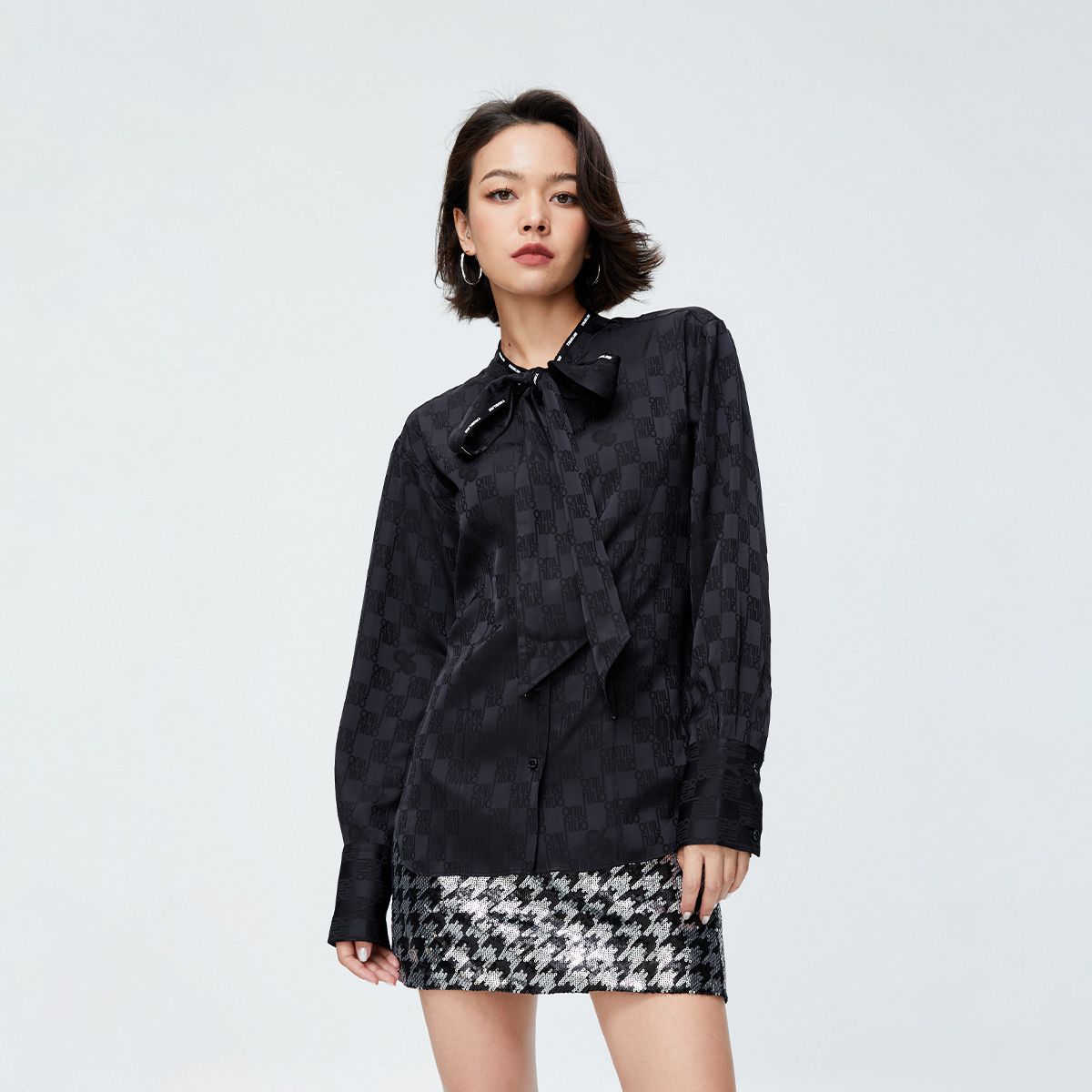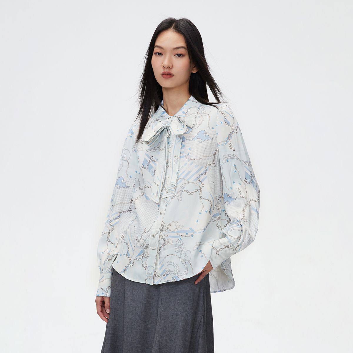 【时尚百搭】夏季百搭可拆卸蝴蝶结满印直筒衬衫女 083546