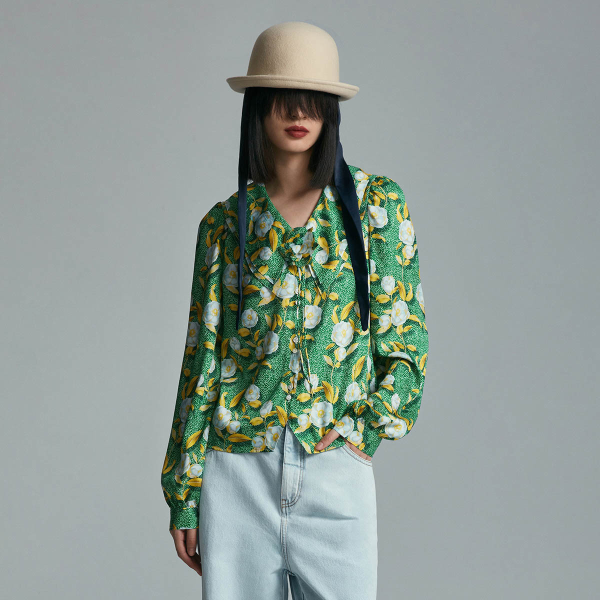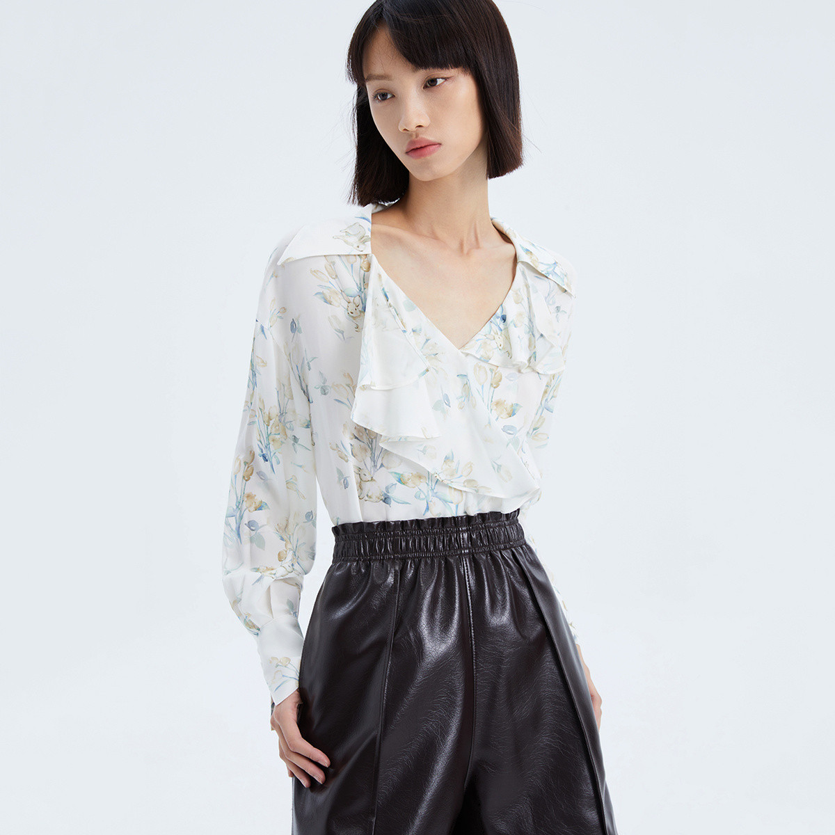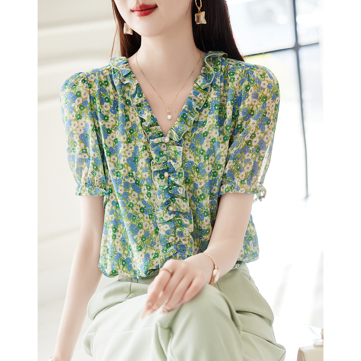 【商场同款】春季浪漫印花优雅荷叶花边垂感雪纺衫 075739