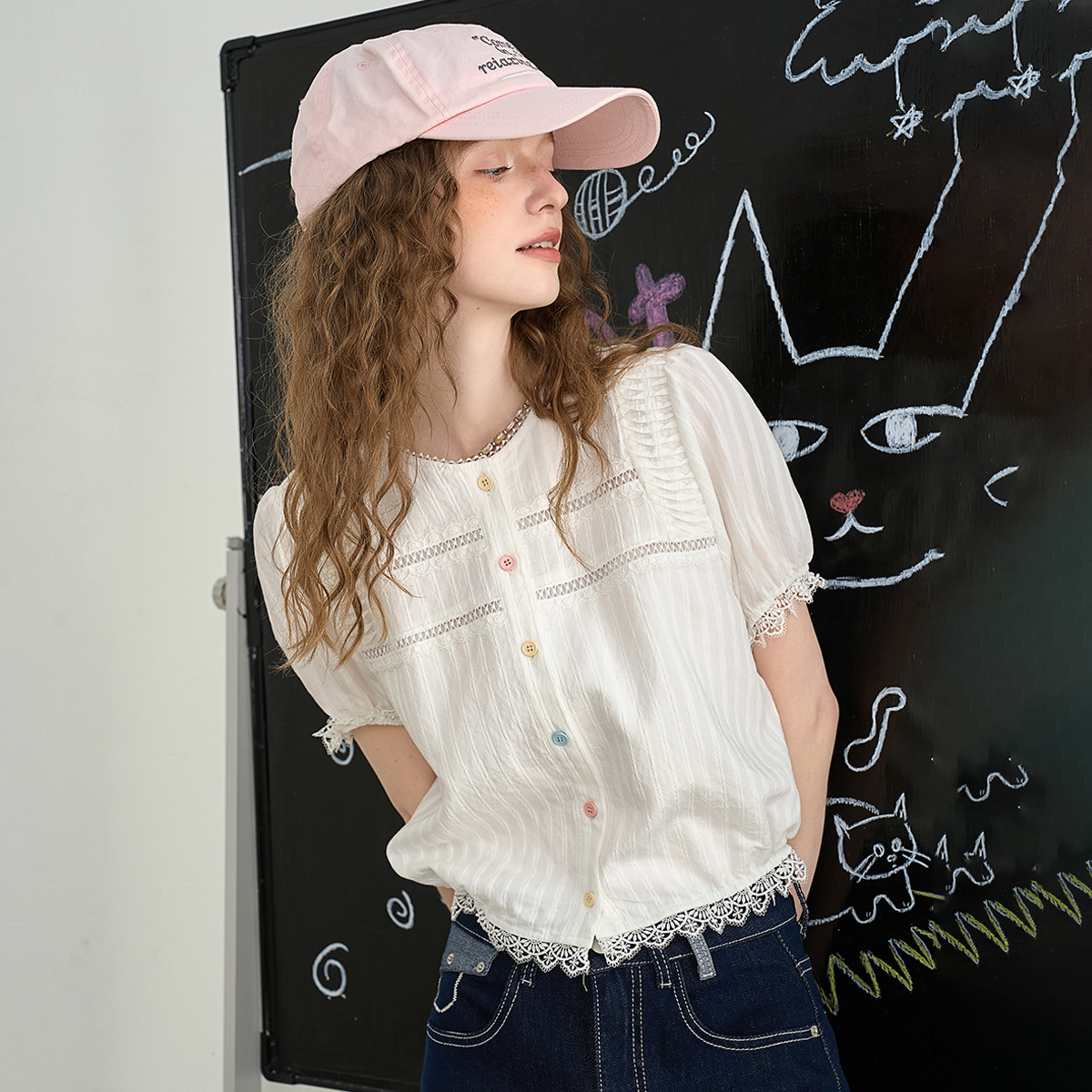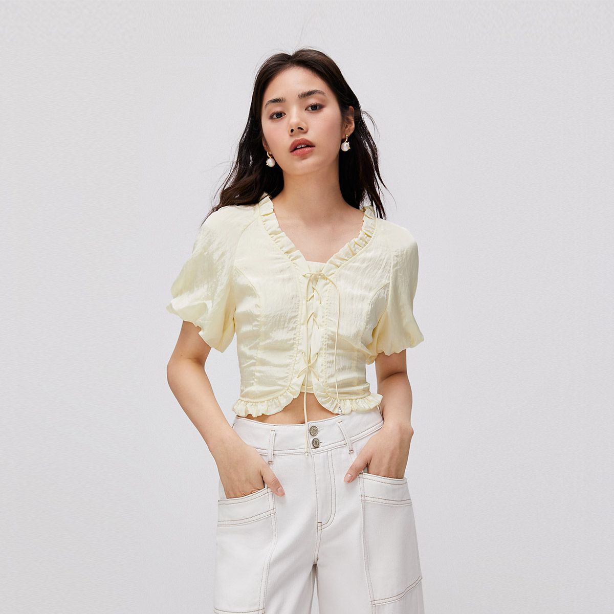 气质花边泡泡袖圆领短款压褶衬衣2025夏季休闲百搭女式衬衫 381789