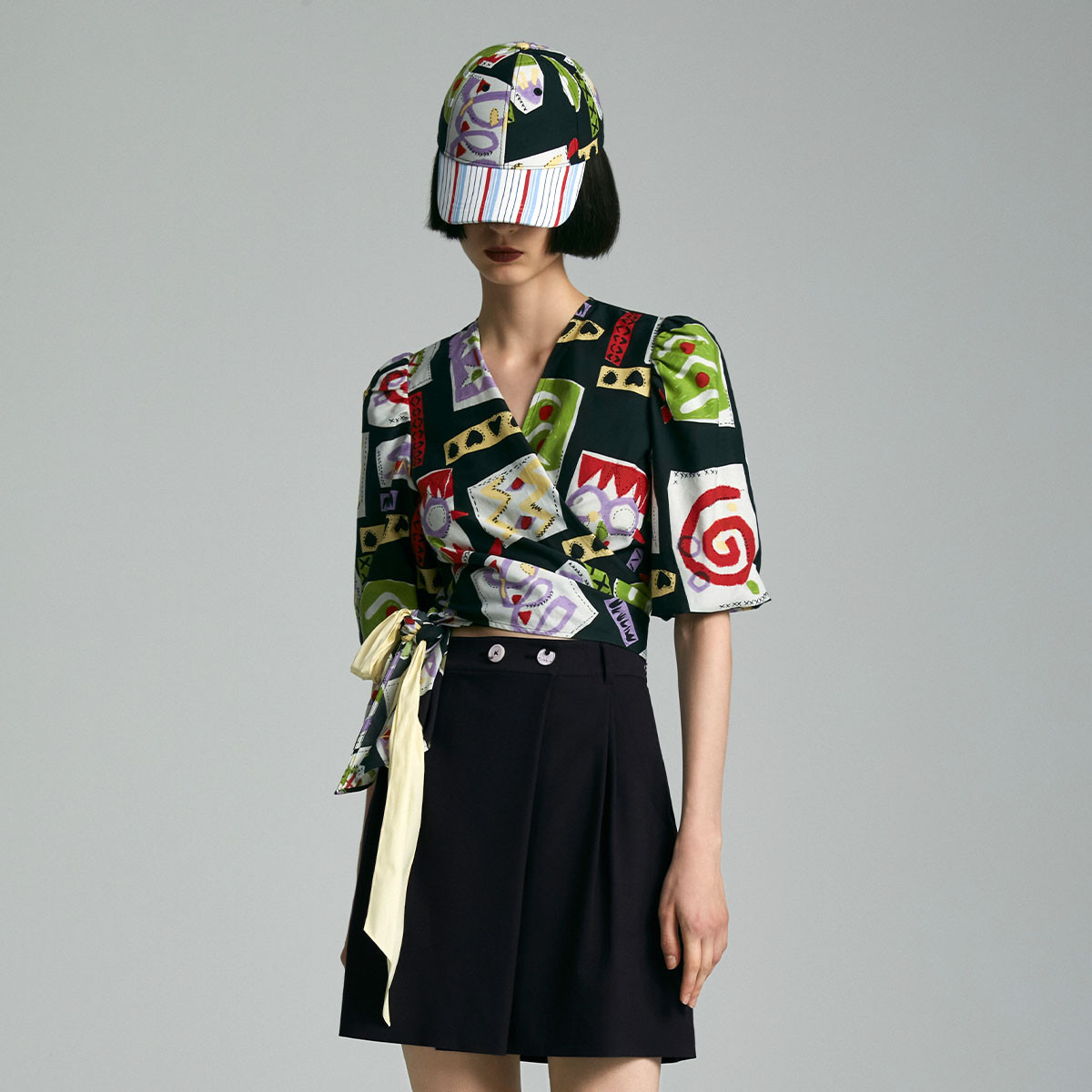 PORTS PURE宝姿女装符号拼贴印花系带衬衫半袖衬衫 454602