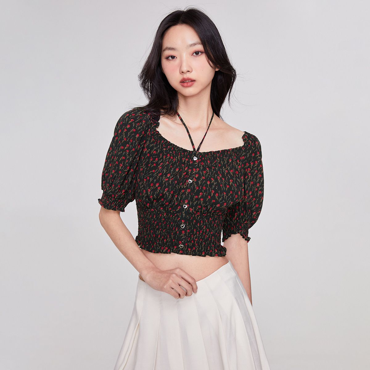 【甜美百搭】夏季泡泡袖方领短款雪纺衫女 605402