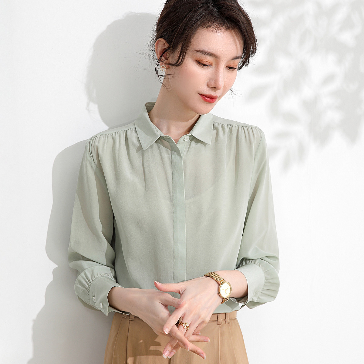 【100%桑蚕丝 纯色百搭】商务通勤长袖真丝衬衫打底衫 206547
