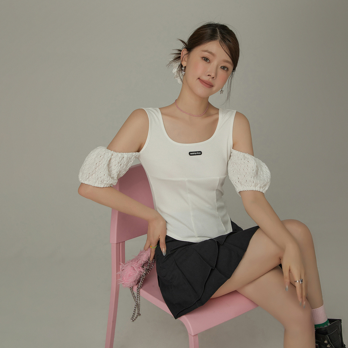 CHUU露肩雪纺衫女夏褶皱镂空拼接泡泡袖短款上衣 789907