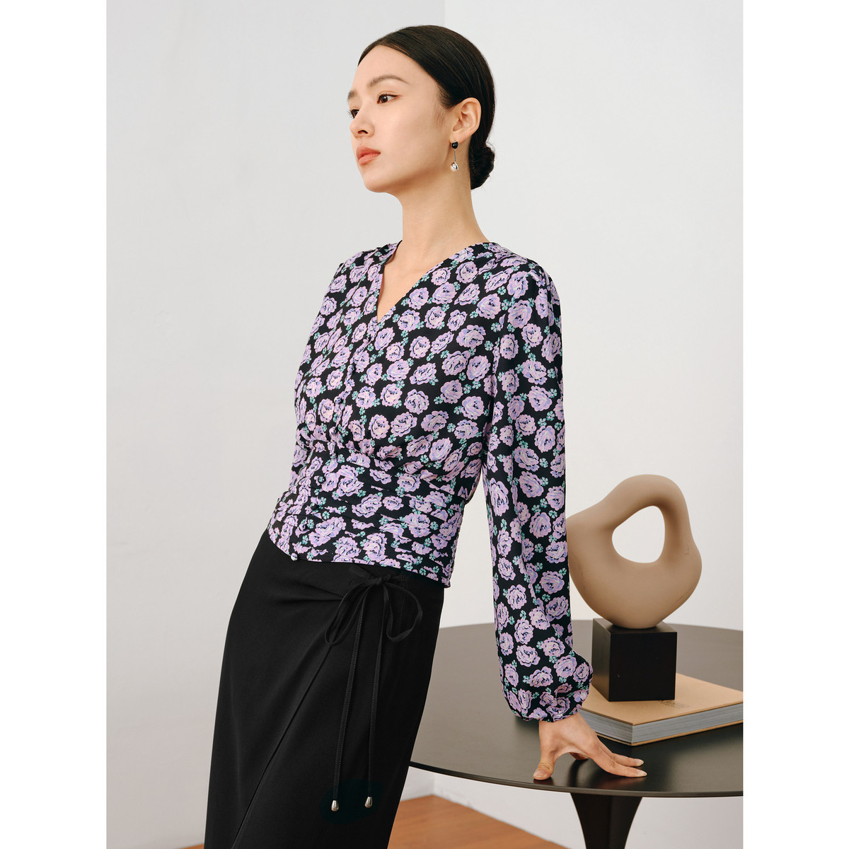 玖姿旗下安娜蔻系列V领优雅法式复古X型雪纺印花长袖上衣女秋季 906892