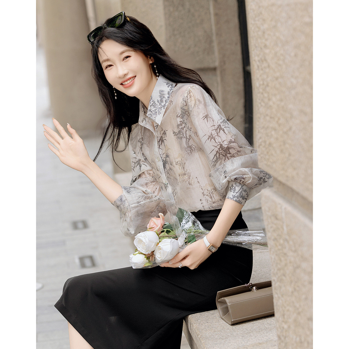 【亚麻莱赛尔混纺】春秋国风新中式印花衬衫抽褶小个子衬衣女上衣 058049