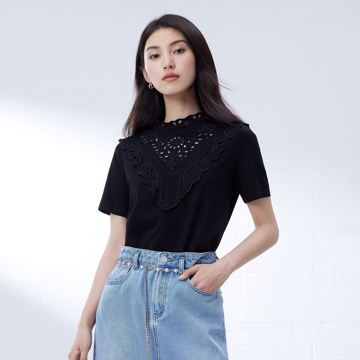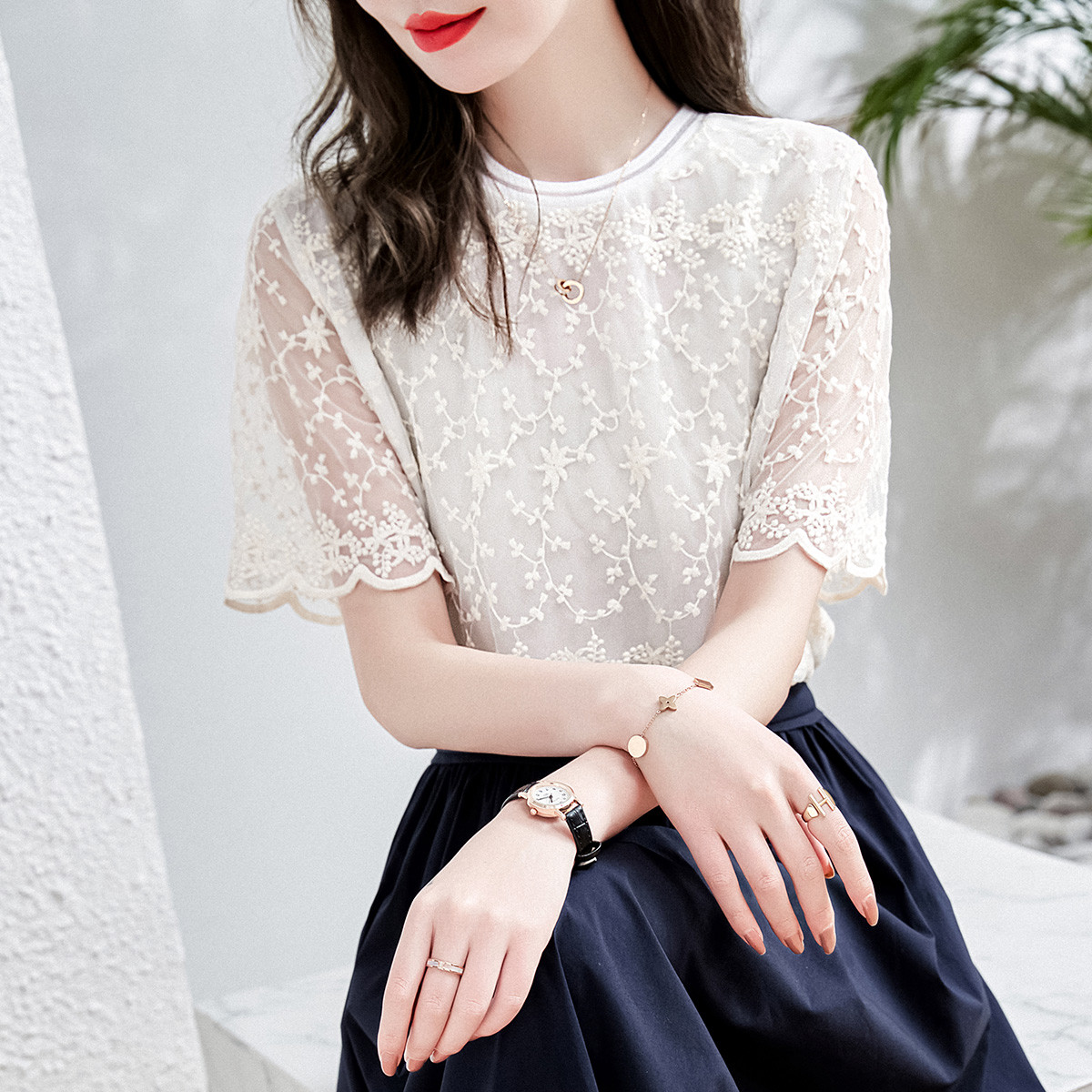 气质蕾丝立领短袖T恤女夏季独特设计感百搭通勤镂空纯色衬衫女 432131