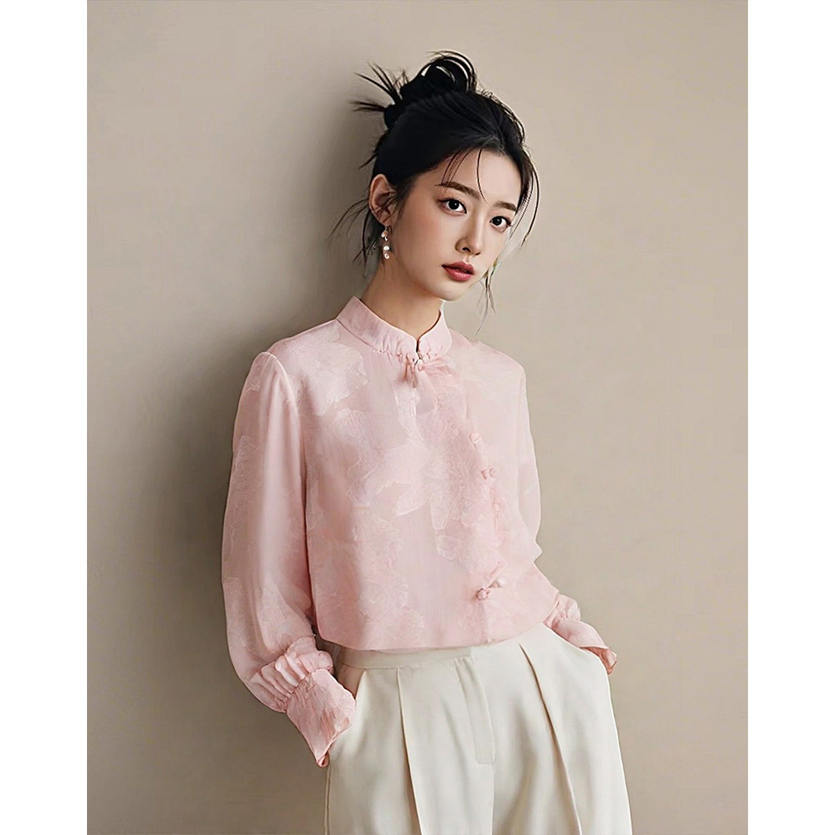 【梦湖之境】秋国风新中式立领盘扣不规则门襟植物印花衬衫女上衣 160449