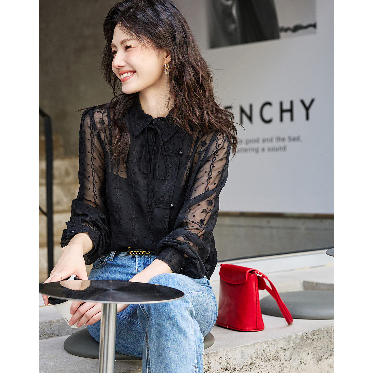 【温柔预告片】春秋法式剪花雪纺衬衫优雅系带舒适藏肉衬衣女装 667905