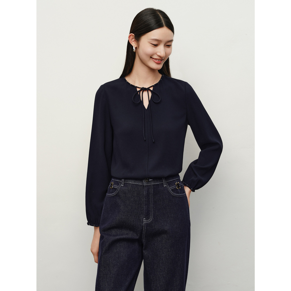 【醋酸系列】旗下安娜蔻系列简约系带领光泽长袖上衣女秋季 154572