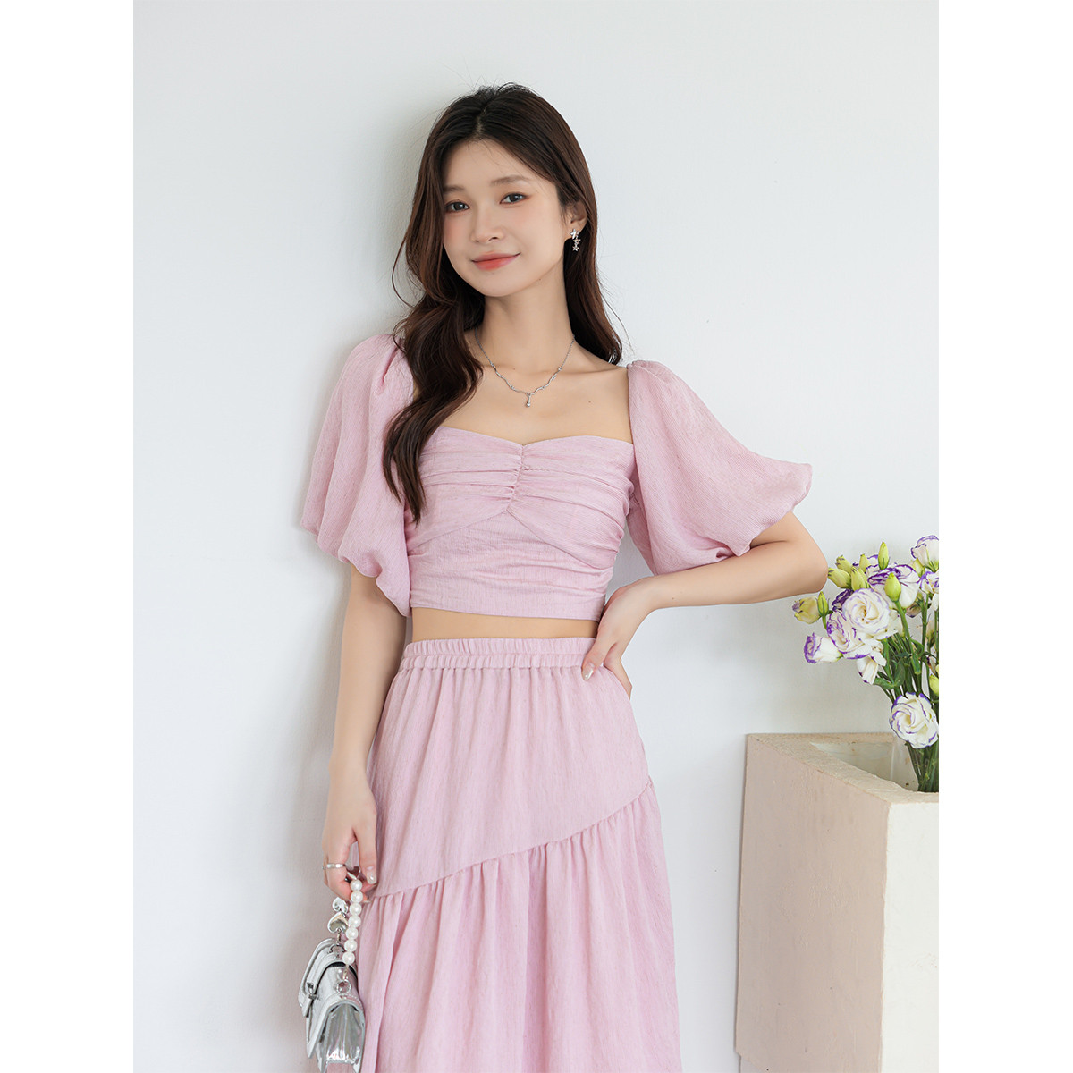 泡泡袖短款上衣法式设计感褶皱收腰显瘦两穿可露肩上衣衬衫女 258499