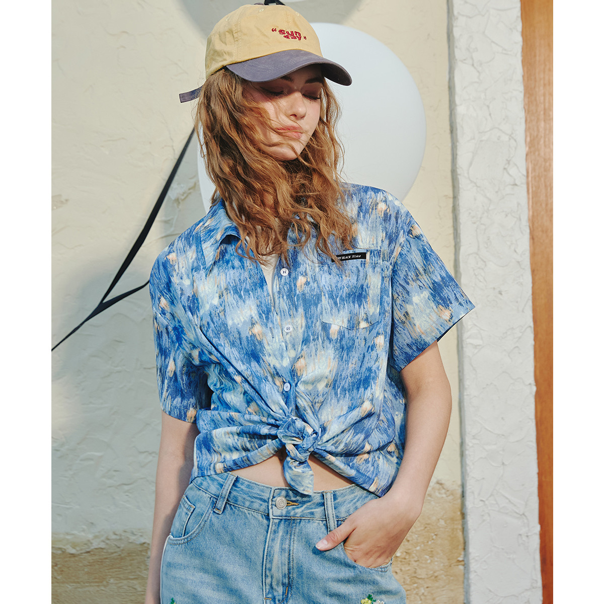 满印油画风设计感个性短袖上衣夏季度假风休闲女式衬衫 450333