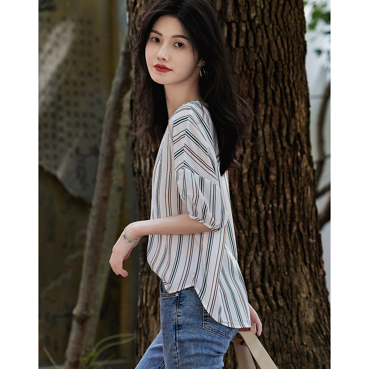 【线条美学】夏轻薄75D加捻纱条纹衬衫不规则V领连袖女式上衣 704449