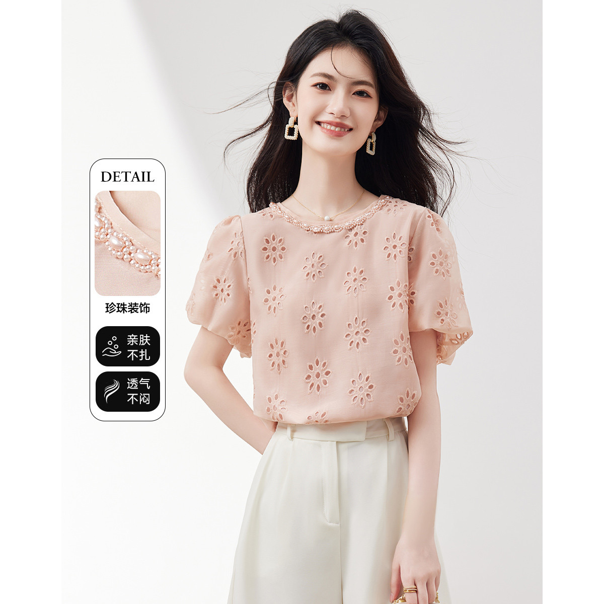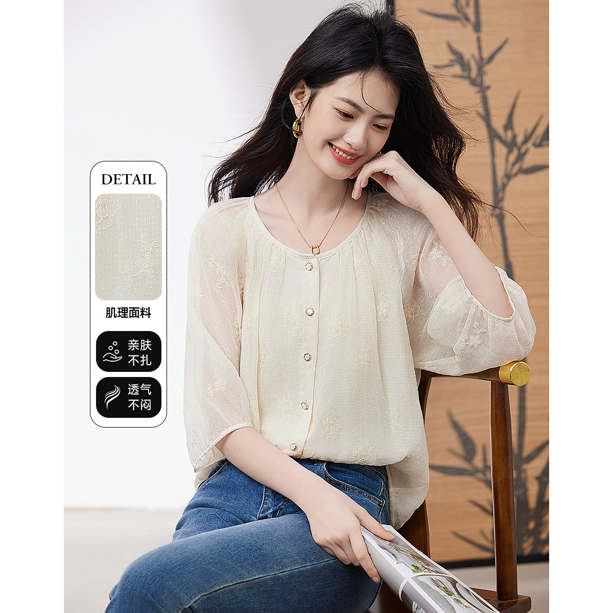 法式衬衫女2025夏新款高级感绣花通勤遮肚显瘦薄款七分袖上衣 359064
