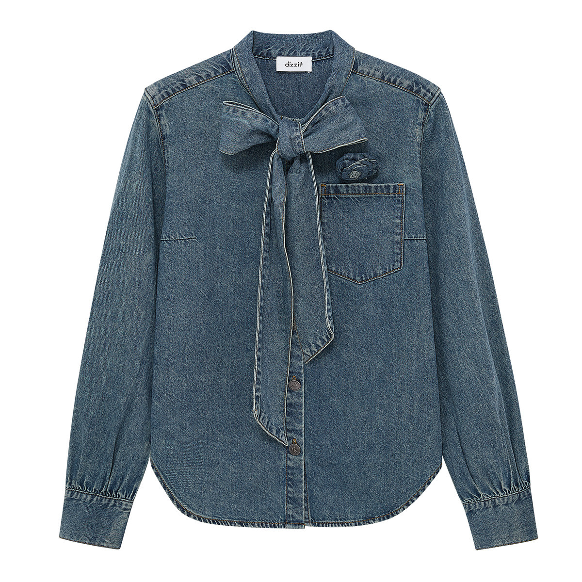 地素牛仔衬衫冬蝴蝶结装饰玫瑰胸针上衣女 146571