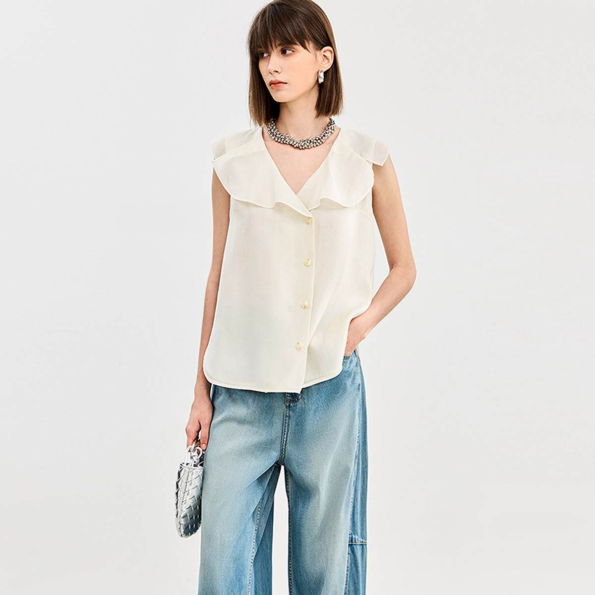 春季款法式优雅知性气质莱赛尔无袖荷叶边设计感通勤衬衫上衣女 135259