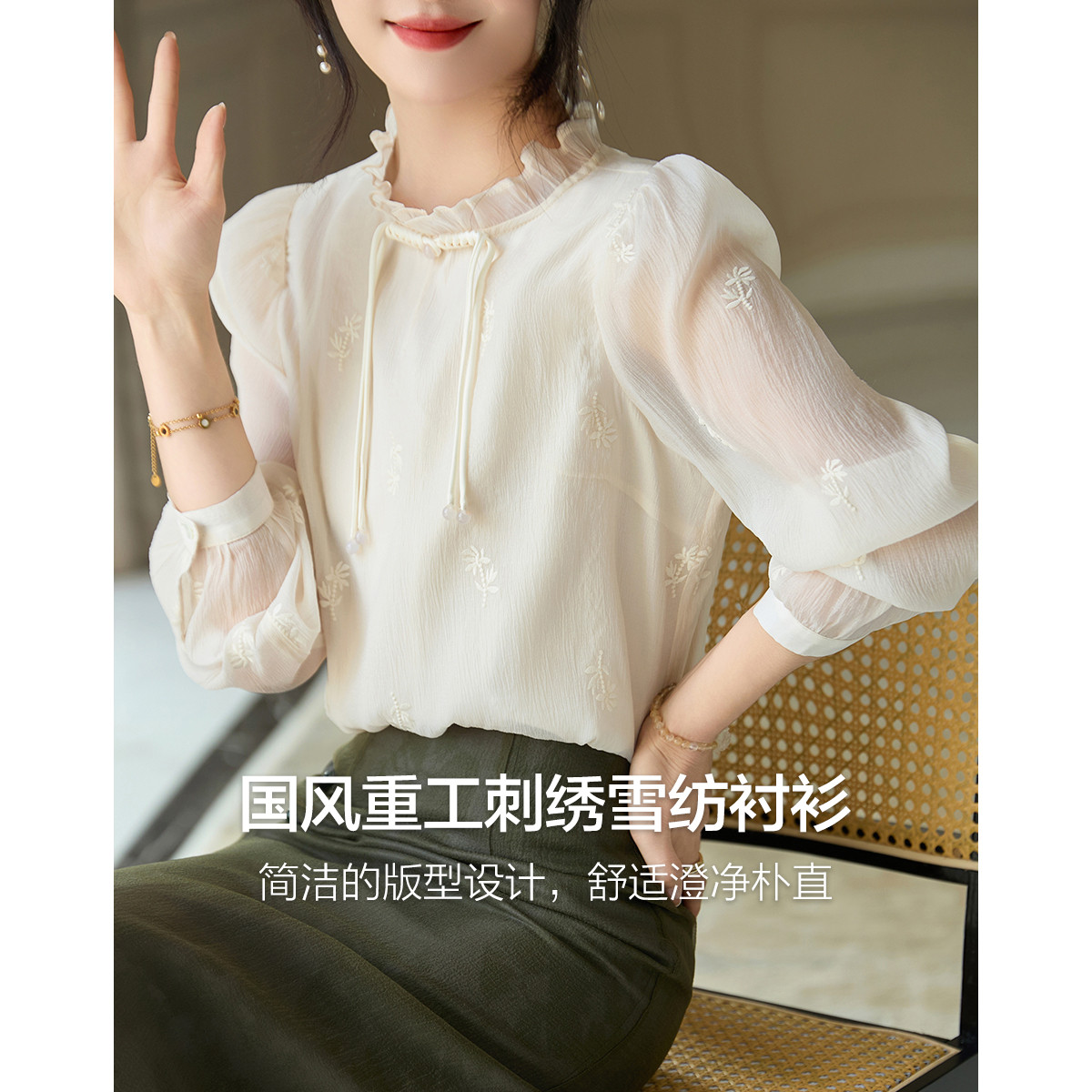 【尤记江南雪】国风新中式刺绣雪纺衬衫盘扣舒适藏肉衬衣女装上衣 560449