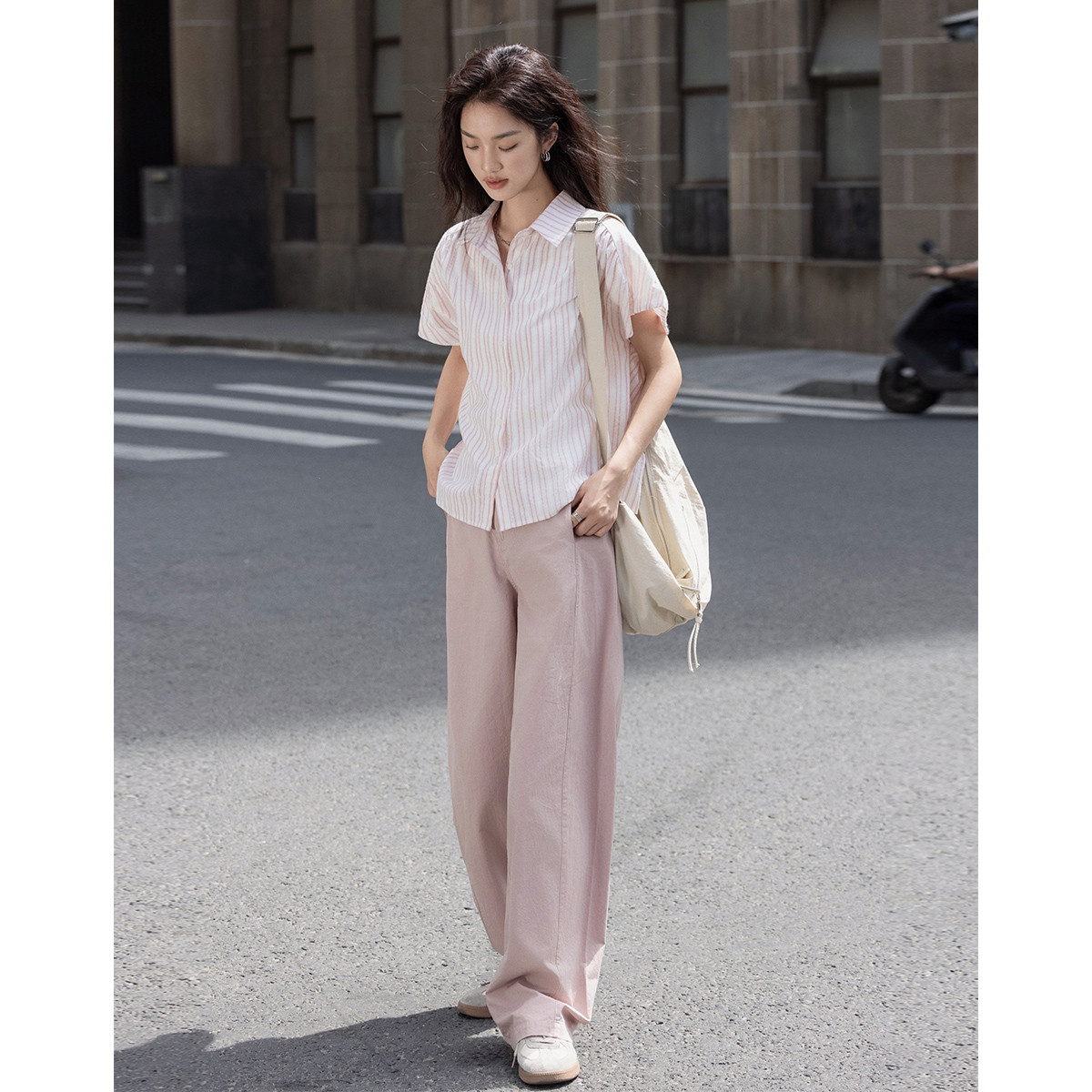 【简约粉休闲衬衫】夏款温柔精致条纹提花翻领短袖衬衫女 242882