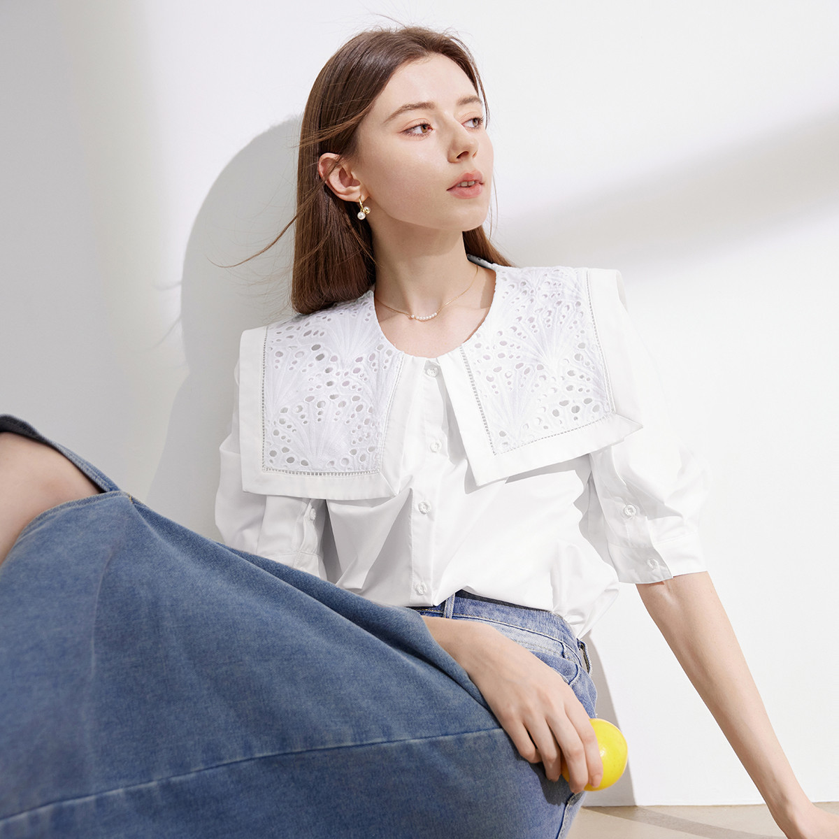夏季热卖纯色刺绣娃娃领设计短袖白衬衫女宽松薄款上衣 973140
