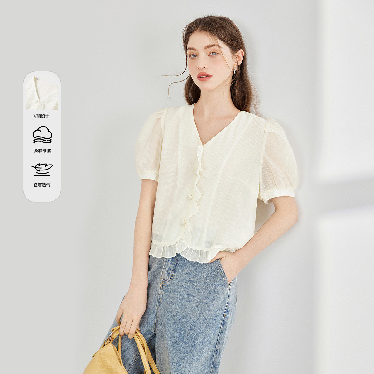 夏季热卖法式泡泡袖雪纺衬衫女气质V领木耳边上衣 915284