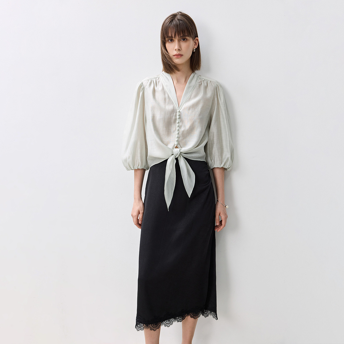 春季V领下摆绑带设计透气薄款时尚百搭上衣衬衫女 838939