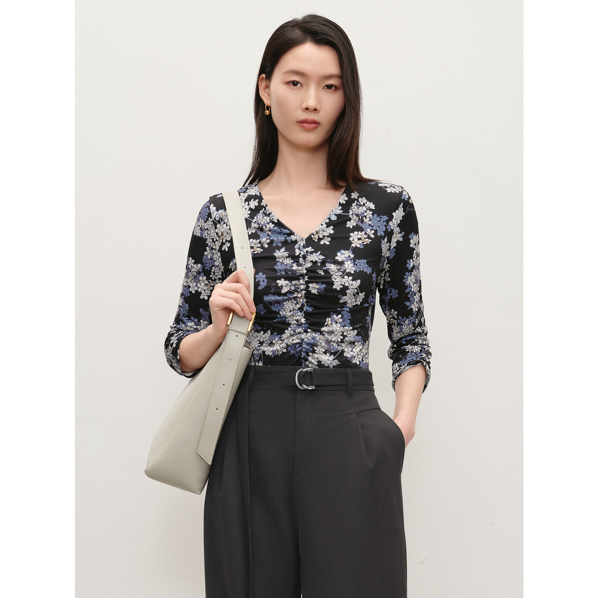 玖姿旗下安娜蔻系列V领优雅法式复古X型雪纺印花长袖上衣女秋季 906892